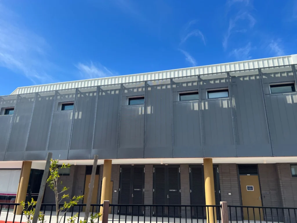 The installation includes a modern metal façade system that enhances the building’s exterior.